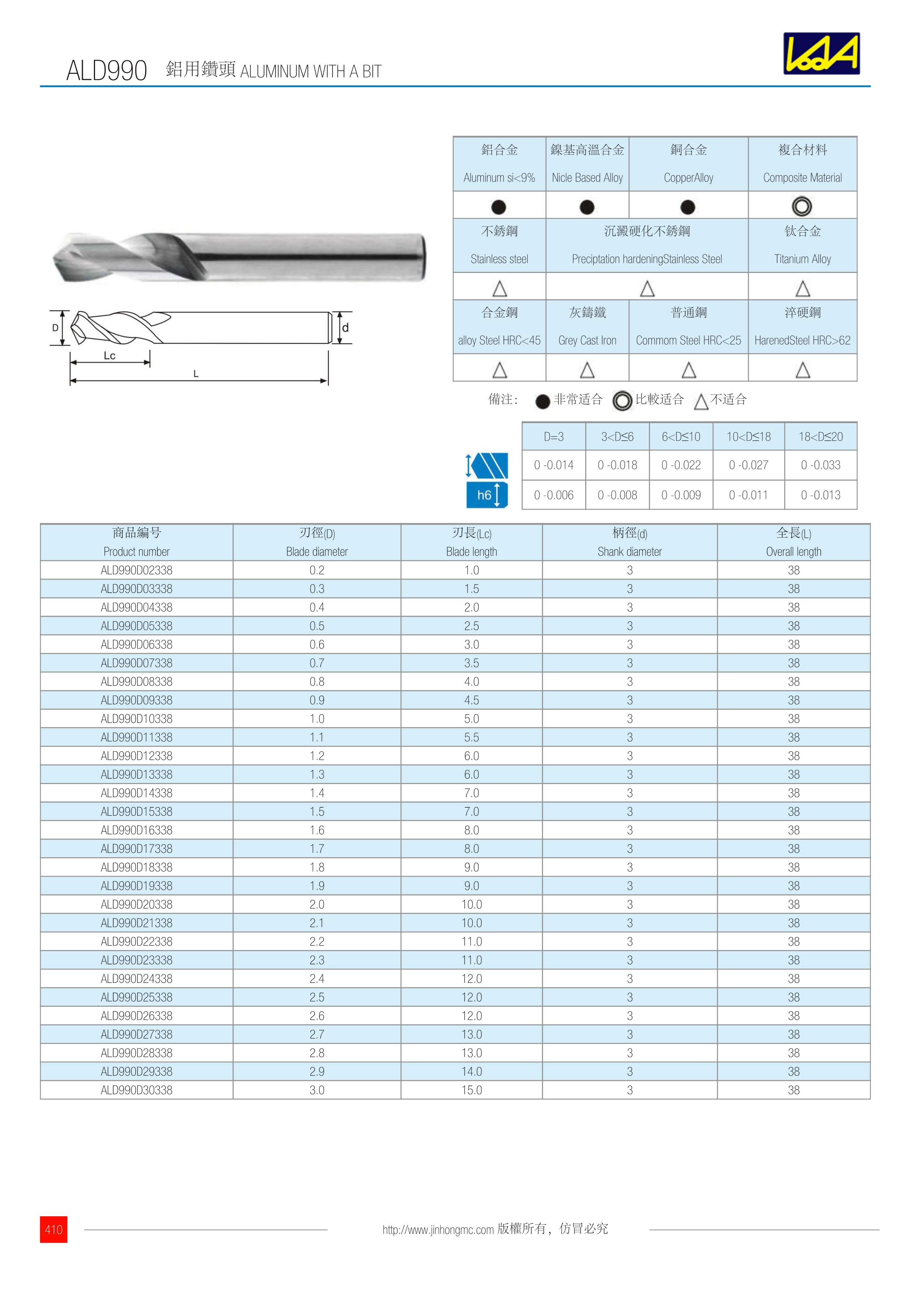 | 商品編號 Product number | 刃徑(D) Blade diameter | 刃長(Lc) Blade length | 柄徑(d) Shank diameter | 全長(L) Overall length |